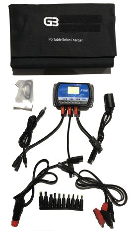 Package Contents: 1 x Portable Solar Charger Pack, 10 x Transfer Adapter, 1 x DC Cable, 2 x Attached Hook, 1 x English User Manual, 20 AMP PVM Solar controller, 20 Amp Cigarette lighter connection, 20 Amp Alligator clamps and 20 Amp fused battery connector.